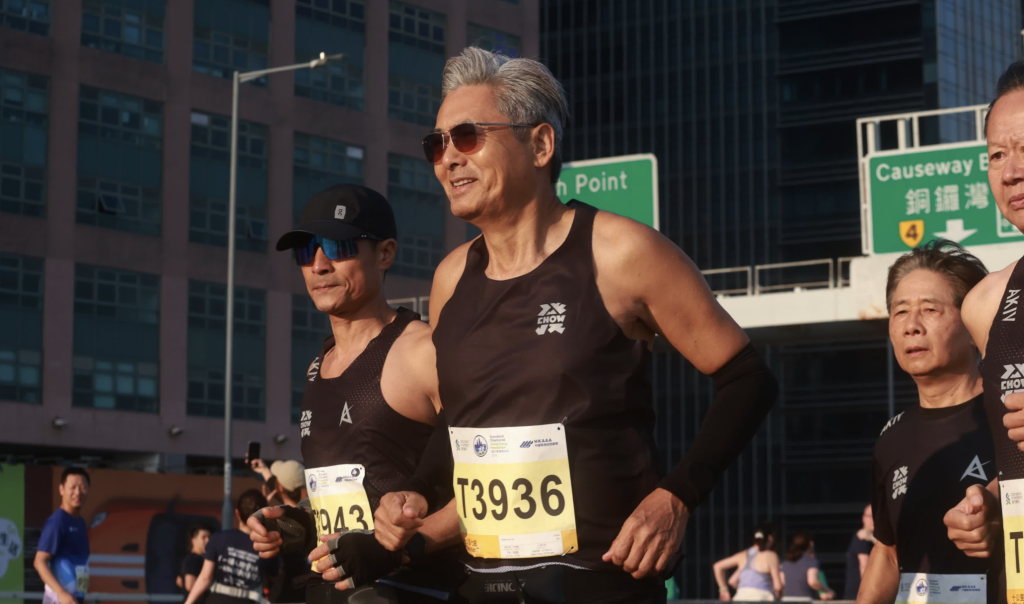 周润发四战港马,今年他重回10公里,陪着好朋友们完赛。
